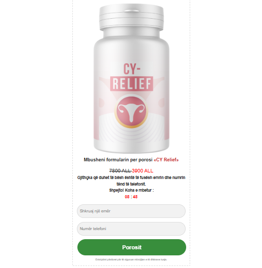 CY-Relief ndihmon pacientët me cystitis të shërohen dhe të përmirësojnë shëndetin e tyre. Pjesa më e mirë është të jesh i përballueshëm me buxhetin. Shumë çmime janë të arsyeshme. Ka edhe oferta të shkëlqyera. Merreni këtë pa u larguar. Bëni porositë në shtëpi. Imazhi më poshtë hap faqen zyrtare të internetit. Lini informacion. Ekipi ynë do t'ju kontaktojë së shpejti për detaje.