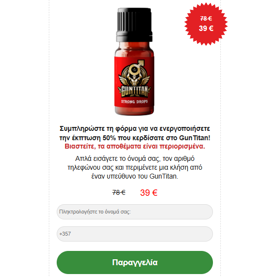 Στην Ελλάδα και την Κύπρο, ο επίσημος ιστότοπος είναι το καλύτερο μέρος για να αποκτήσετε το GunTitan σε κανονική τιμή. Τώρα συμπληρώστε τη φόρμα εκεί. Δεχτείτε μια κλήση για να επιβεβαιώσετε την παραγγελία σας. Το πακέτο θα φτάσει σε λίγες εργάσιμες ημέρες. Παραγγείλτε σήμερα για έκπτωση 50% στο GunTitan για τους πιο γρήγορους πελάτες.